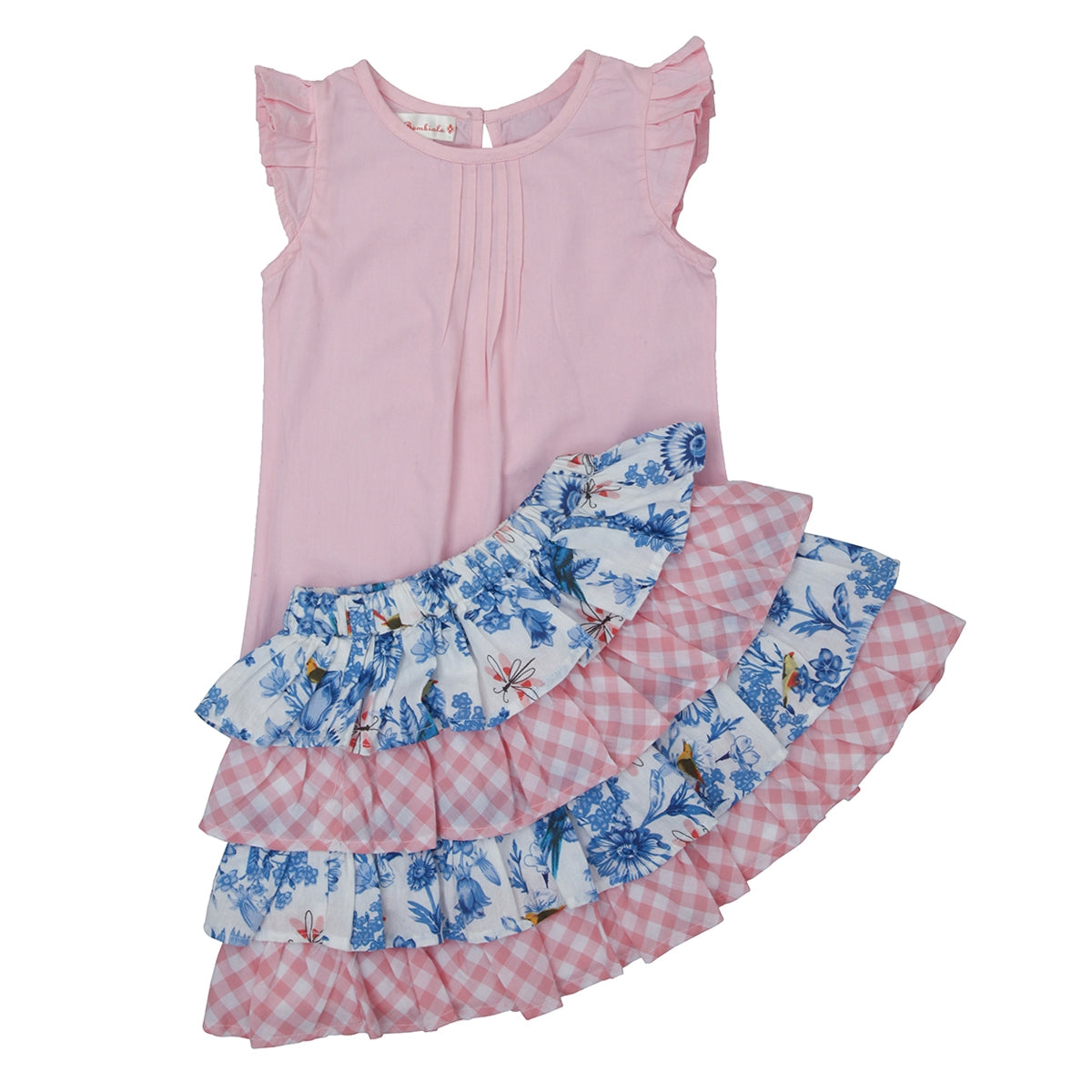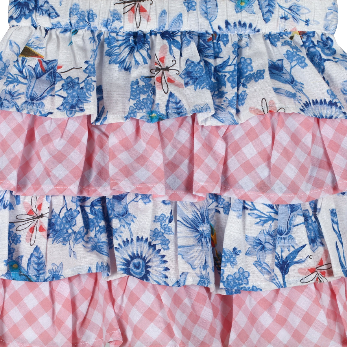 Playful meets pretty in this unique tiered skirt, combining a vibrant blue floral print with contrasting pink check bias panels for a fun look. Crafted from 100% cotton, the tiered design adds volume and movement, perfect for twirling through your day in style. Light, breathable, and full of charm this skirt is made for sunny adventures.