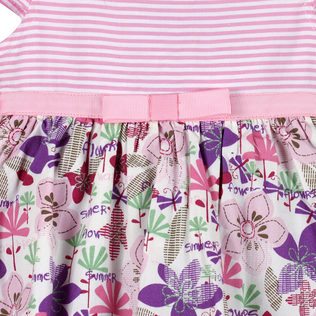 Sweet and stylish, this pink floral with stripe bodice dress is made from 100% breathable cotton for all-day comfort. It also features a charming grosgrain bow detail at waist. and is completely lined using soft 100% cotton fabric for added comfort. This dress is perfect for any sunny day, outing or special occasion.