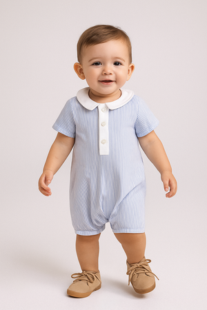 Comfortable yet charming white romper for boys, made from 100% soft cotton fabric stripe with cotton lining for a baby's comfort. This romper offers a clean and classic look with a touch of texture.