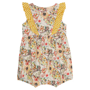 Bring on the sunshine with this charming yellow floral printed romper and check ruffles, a perfect blend of playful and chic. It is made of 100% cotton fabric and is perfect for the sunny days.