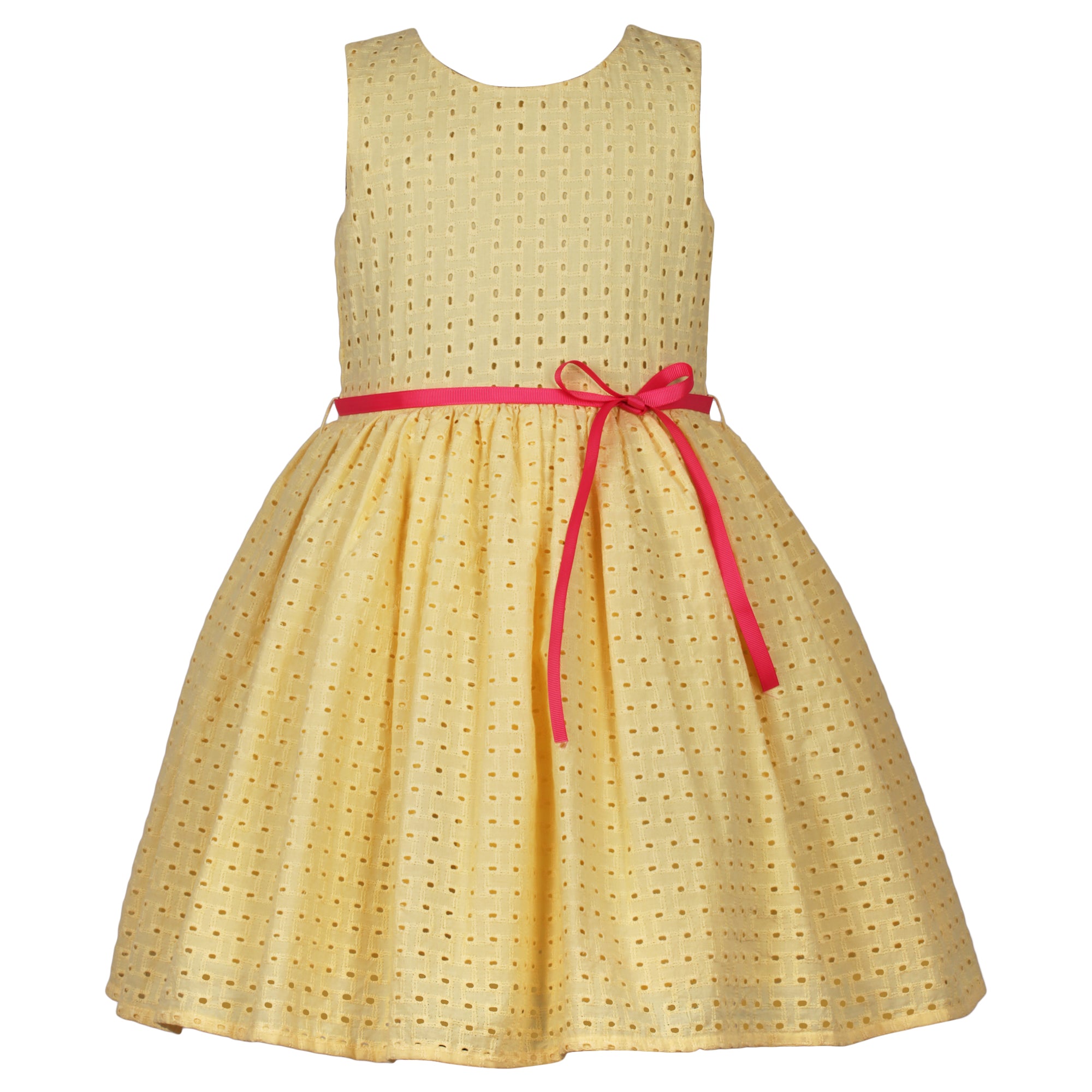 Bring in the sunshine to any day with this beautiful , schiffly embroidered yellow dress, This dress is beautifully accented by a bright pink grosgrain ribbon belt at waist.